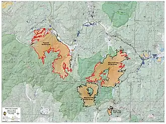 The West Fork Complex was a complex of wildfires near Wolf Creek Pass in southern Colorado.[2] The first fire, the West Fork fire, was started by lightning at about 1 PM on June 5, 2013. All three fires were started by lightning. As the fire moved into heavy dead timber in early June, thousands of firefighters struggled to prevent movement of the fires into populated areas.[1]