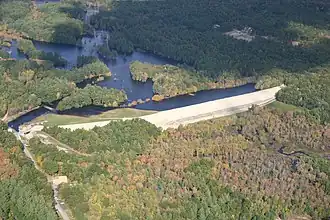 West Hill Dam Reserve is a United States Army Corps of Engineers flood control project with a recreational park and wildlife management area located at Uxbridge, Massachusetts. The West Hill Dam Project was completed in June 1961.[1] It is located on the West River, one of the branches of the Blackstone River which flows from Worcester, Massachusetts, to Providence, Rhode Island. The West River originates in Grafton, Massachusetts, at Cider Mill Pond and Silver Lake, near Upton, Massachusetts, and the Upton State Forest. The dam is unusual in that it is not filled unless there is a flood. West Hill Dam was built after devastating floods during the 1950s; it is intended to protect the Blackstone Valley from future destructive flooding. The cities and towns downriver from Uxbridge, including Millville, Blackstone, Woonsocket, North Smithfield, Cumberland, Lincoln, Central Falls, Pawtucket and Providence, Rhode Island, suffered extensive flooding from the Blackstone during Hurricane Diane in 1955. Hurricane Donna tested this new dam in 1960 as the eyewall passed over. The West Hill Dam is located in the Blackstone River Valley National Heritage Corridor near the Blackstone River and Canal Heritage State Park. Park rangers provide visitor assistance and offer scheduled interpretative programs. Fishing, hunting, and wildlife viewing opportunities are available year-round. The park has a recreation area, 34 picnic sites, one playground, a swimming area and five miles of hiking trails. However, access to the park from West Hill Road is currently blocked as of 2021 because of landowner disagreements. [2] West Hill Dam (where the Army Corps project is based) is also the field office for the Charles River Natural Valley Storage Area. It consists of scattered wetlands in the upper and middle Charles River watershed, between the towns of Bellingham and Needham. The wetlands provide flood storage area, fisheries, wildlife management, and recreation. The Charles River is the well-known watercourse that flows into Boston Harbor.