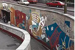 The Collective's core commissions included a relief mural for Bell Street Passage in Birmingham, installed in 1987 and now lost, which was a pivotal example of how artists responded to evolving public art policy by producing inclusive, public‑oriented, and regeneration‑aligned artworks within a broader context of post-industrial urban regeneration and related cultural policy in the UK during that period.[1]