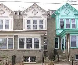 Other developments introduced urban density and architectural uniformity: the Queen Anne style with columned porches and decorative spindlework, brickwork and corbelling; steeply pitched gables with fishscale slate shingles; turrets; balconies; and windows with a single pane surrounded by small panes. These houses are typical of the early 20th-century developments in West Philadelphia, and are unified by rhythmic patterning of porch and gable features. The second story, projecting, semi-hexagonal bay is incorporated into this design, an element which defines the later rowhouses.
