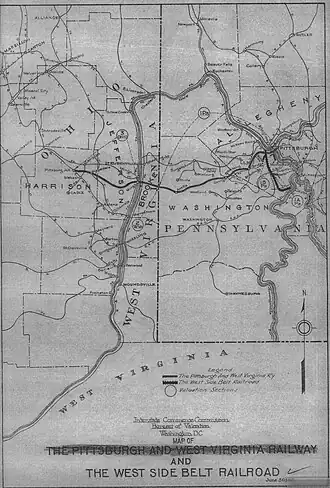 The West Side Belt Railroad (reporting mark WSB)[1] was a standard gauge railroad incorporated July 25, 1895. It ran from Temperanceville, to Clairton, Pennsylvania, with a branch to Banksville. It acquired the Little Saw Mill Run Railroad by merger in 1897, and the Bruce and Clairton Railroad in 1901.[2] The railroad was bankrupt in 1908.[3] The line was purchased by the Pittsburgh and West Virginia Railway in 1920.[4]