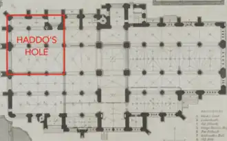 Following the Reformation, St Giles' had been partitioned internally into smaller churches. Some time between the Restoration and the Revolution, the westernmost division, housing the Tolbooth Kirk, was partitioned into northern and southern parts.[7] The northern part, forming the north-western corner of St Giles', became known as "Haddo's Hole" (or "Hold") in reference to John Gordon of Haddo: a leading royalist, who was imprisoned in the room above the north porch prior to his execution in 1644. Some sources also refer to it as the "Little Kirk" due to its size.[1][8] Prior to its occupation by the congregation, the partition was used as a law court.[9] Recalling the entry to Haddo's Hole prior to William Burn's restoration of St Giles' of 1829–1833, Josiah Livingston wrote: