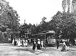 In addition to the lines mentioned above, there were other sections of line owned by the WBV that were used exclusively by third-party railroads. The line from Kaisereiche to the corner of Rubensstrasse and Casanovastrasse, which opened on September 1, 1905, was owned by the WBV on Friedenau territory.[11][12] On May 27, 1907, a line through Pariser Straße between Kaiserallee and Uhlandstraße went into operation. On November 27, 1911, this connection was extended beyond Olivaer Platz to Xantener Straße. The line was used exclusively by GBS lines.[5] The route through the Südwestkorso opened on May 15, 1911, served line O of the Berlin-Charlottenburg Tramway (BCS).[13] In the nearby Nestorstraße there was a service line to serve the Betriebshof XIII of the GBS.[14]