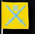 The coat of arms of the Western Military District Staff 1983–1993. Blazon: "Azur, an erect sword with the area letter (V - West) surrounded by an open chaplet of oak leaves, all or."[1]