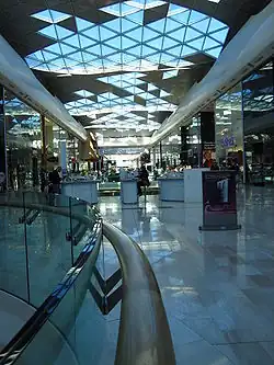 The development was built by Westfield Construction, the developer's own construction arm and was delivered on schedule.[10] Robert Bird Group were the structural engineers for the job.[11] The roof was designed by Knippers Helbig Advanced Engineering (Stuttgart, Germany).[12] The project took five years to build, employing 8,000 people.[13] During the site development period, up to 3000 local people received pre-employment training through a partnership scheme aiming to ensure that a significant proportion of the centre's jobs were taken up by local residents. 40% of the centre's management staff had been locally recruited at the time when the centre opened.[14]