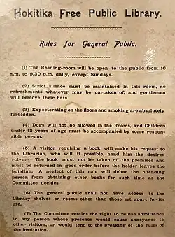 Carnegie often stipulated that the libraries he funded would be free to use, which was sometimes at odds with local councils' desire to generate revenue.[1] The Hokitika library was no exception: any resident could read books and newspapers in the reading room for no charge, but although "FREE PUBLIC LIBRARY" was written in capitals above the portico, borrowing books in fact required a paid subscription – violating the letter and spirit of the Carnegie grant.[1]