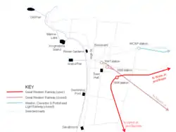 - ^ Padgett, David (June 2018) [1989]. Munsey, Myles (ed.). Railway Track Diagrams 3: Western & Wales (6th ed.). Frome: Trackmaps. map 7A. ISBN 978-1-9996271-0-2.