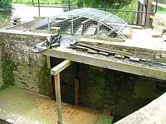 Having completed a multi-million pound B2133 road bridge-centred project (see below), restoration has continued northwards. Devil's Hole Lock (lock 6) had been partially destroyed by the Canadian army as part of a training exercise in 1942. It has been rebuilt and extended to take 72-foot (22 m) narrow boats. The lock was reopened on 17 April 2010, and the opening ceremony was carried out by Colonel Paul Rutherford, the Senior Army Adviser to the Canadian High Commissioner.[24] Southland Lock (lock 7) required significant rebuilding, as many of the original bricks were removed in the 1930s, to be re-used by a local religious order.[25] The lock was reopened on 21 June 2014 by Simon Carter, a local landowner with land adjoining this section of the canal.[26] Working parties have since concentrated on the building of Gennets Bridge Lock (lock 8), a major exercise requiring the construction of a new concrete shell, faced with locally made bricks, and a bridge for a bridleway[27] as nothing was left of the original lock structure.