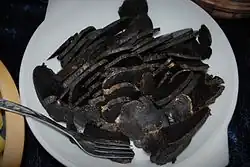 The tradition of eating pilot whale meat and blubber dates back many centuries. Today, it is consumed as a Faroese delicacy.[33] Meat and blubber, Tvøst og spik in Faroese, can be stored and prepared in various ways. When fresh, pilot whale meat can be served as a steak called a grindabúffur. Meat, blubber and potatoes are also boiled together in stews, while slivers of the blubber are a popular accompaniment to dried fish. On special occasions, a dish called kalt borð, a spread of cold dishes and cakes often including dried pilot whale meat and salted blubber, can be served.[34]