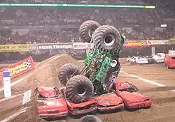 Monster trucks often perform wheelies during shows. Monster trucks have performed power wheelies, slap wheelies, and sky wheelies. To perform a sky wheelie, a monster truck jumps in such a way that the truck is vertical in the air, with the front end of the truck pointing upwards.