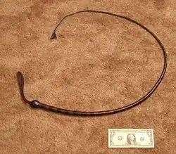 Snake whips (or snakewhips) are a type of single-tailed whip. The name snake whip is derived from the fact that this type of whip has no handle inside and so can be curled up into a small circle which resembles a coiled snake. They were once commonly carried in the saddlebag by cowboys of the old west. A full sized snake whip is usually at least 1.2 metres (4 ft) in length (excluding the fall and cracker at the tip of the whip) and around one inch in diameter at the butt of the whip.