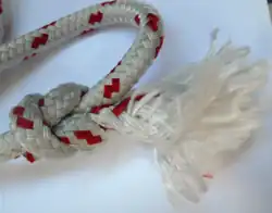 Some whippings are finished cleanly, as by drawing the bitter end of the cordage beneath the whipping itself. Others are tied off or have the end(s) of the twine sewn through the rope. According to The Ashley Book of Knots, "The purpose of a whipping is to prevent the end of a rope from fraying ... A whipping should be, in width, about equal to the diameter of the rope on which it is put ... [Two sailmaker's whippings], a short distance apart, are put in the ends of every reef point, where the constant 'whipping' against the sail makes the wear excessive; this is said to be the source of the name whipping."[1] The other type of stopping knot is a seizing knot.