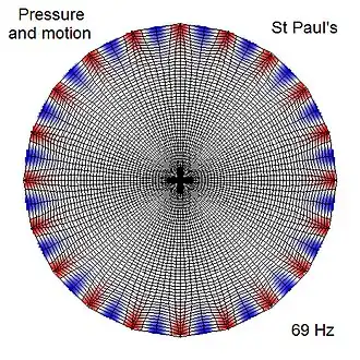 Rayleigh developed wave theories for St Paul's in 1910[6] and 1914.[7] Fitting sound waves inside a cavity involves the physics of resonance based on wave interference; the sound can exist only at certain pitches as in the case of organ pipes. The sound forms patterns called modes, as shown in the diagram.[1]