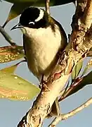 The white-throated honeyeater (Melithreptus albogularis) is a bird of the honeyeater family Meliphagidae native to New Guinea and eastern and northern Australia. It is 11.5 to 14.5 cm (4.5 to 5.7 in) long, olive-green above and white below, with a black head, a white or pale blue patch over the eye, and a white stripe across the nape.