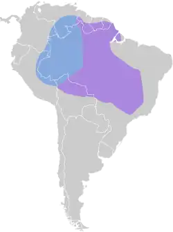 The white-throated kingbird's full range has not been firmly established. It is definitely found from eastern Ecuador and eastern Peru east through northern Bolivia, southern Venezuela, and Guyana and Suriname into much of Brazil. In Brazil its range's eastern edge roughly extends from Amapá south through Pará, Tocantins, and western Bahia and Minas Gerais into Mato Grosso do Sul and São Paulo.[5] McMullan's field guide to Colombia includes the species; the South American Classification Committee of the American Ornithological Society (SACC) has no confirmed records there and so classes it as hypothetical.[6][4] The SACC also classes it as hypothetical in Argentina and as a vagrant in French Guiana.[4]