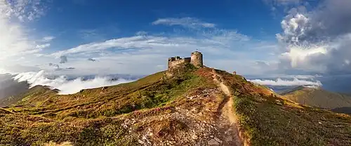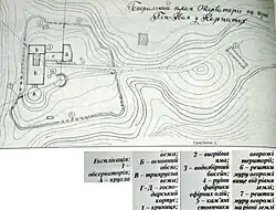 The whole complex consists of three major features that could be considered as separate structure connected together: a tower, a main building, and smaller service attachment. Biały Słoń had five stories facing the Czechoslovakian side (today Zakarpattia Oblast), and two stories facing the Polish side (today Ivano-Frankivsk Oblast).[6] The whole complex was built mostly from local sandstone.[6] Due to lack of roads, the construction materials were brought by horses, or either by hand or on the backs of local Hutsuls and soldiers of the 49th Hutsul Rifle Regiment from the Vorokhta train station located some 70 km (43 mi) away.[6][5] The walls of a lower attachment and the semi-basement floor have a thickness of 1.5 m (4.9 ft), while upper floors - 1 m (3.3 ft).[6] The roof of a building was covered with copper sheets.[6] On the southern side there was a rotunda on which a telescope was located.[6] The copper dome of the telescope opened automatically.[6]