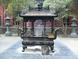 In the Main Hall, at the altar, there are three statues, the central statue is that of Sakhyamuni Buddha flanked by statue of Manjushri and Samantabhadra. There is a very large bell weighing more than 1 tonne (a figure of 2.5 tonnes is also mentioned), installed during the reign of the Jiajing Emperor of the Ming dynasty, near the altar, which is struck in time during the chanting of prayers by the monks. A community of ten thousand monks resided here during the Tang dynasty.[1][38] The inscription on the bell reads: "The sound of the Bell resounds in Buddha's temple causing the ghosts in Hell to tremble with fear."[39]