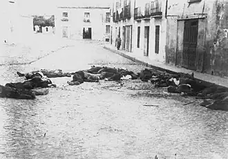 The Nationalists committed their atrocities in public, sometimes with assistance from members of the local Catholic Church clergy. In August 1936, the Badajoz massacre ended with the shooting of between 500 and 4,000 Republicans;[24] and on August 20, after a Mass and a multitudinous parade,[25] two Republican city mayors (Juan Antonio Rodríguez Machín and Sinforiano Madroñero), Socialist deputy Nicolás de Pablo and 15 other people (7 of them Portuguese) were publicly executed. The assassination of hospitalized and wounded Republican soldiers was also a common practice.[26]
