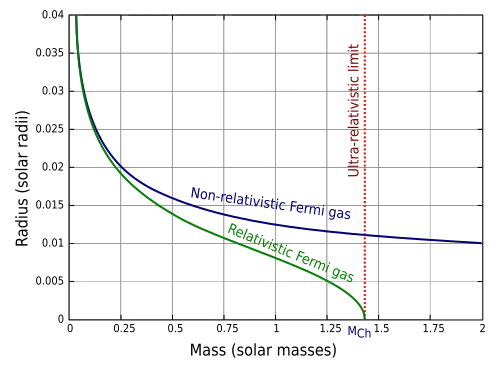 For a more accurate computation of the mass-radius relationship and limiting mass of a white dwarf, one must compute the equation of state that describes the relationship between density and pressure in the white dwarf material. If the density and pressure are both set equal to functions of the radius from the center of the star, the system of equations consisting of the hydrostatic equation together with the equation of state can then be solved to find the structure of the white dwarf at equilibrium. In the non-relativistic case, the radius is inversely proportional to the cube root of the mass.[46]: eqn.(80)  Relativistic corrections will alter the result so that the radius becomes zero at a finite value of the mass. This is the limiting value of the mass—called the Chandrasekhar limit—at which the white dwarf can no longer be supported by electron degeneracy pressure. The graph on the right shows the result of such a computation. It shows how radius varies with mass for non-relativistic (blue curve) and relativistic (green curve) models of a white dwarf. Both models treat the white dwarf as a cold Fermi gas in hydrostatic equilibrium. The average molecular weight per electron, μe, has been set equal to 2. Radius is measured in standard solar radii and mass in standard solar masses.[46][61]