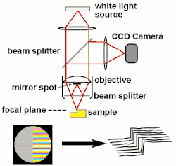 Fig. 3 illustrates a white light interferometric microscope using a Mirau interferometer in the objective. Other forms of interferometer used with white light include the Michelson interferometer (for low magnification objectives, where the reference mirror in a Mirau objective would interrupt too much of the aperture) and the Linnik interferometer (for high magnification objectives with limited working distance).[1] The objective (or alternatively, the sample) is moved vertically over the full height range of the sample, and the position of maximum fringe contrast is found for each pixel.[2][3]