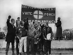 From the late 1970s the National Front (NF), a British neo-fascist party which was losing ground in electoral politics, began to turn toward the skinhead movement to obtain grassroots supporters among the working class. The Rock against Communism (RAC) genre, relaunched in 1982 by Skrewdriver leader Ian Stuart Donaldson in association with the National Front, appeared in reaction to the Rock against Fascism movement.[37][38][26] To draw new adherents, the National Front attempted to use the white power music scene to re-frame its message from overt hate of foreigners and minorities to self-love and collective defence of white identity. Donaldson and the National Front founded a record label named White Noise Club, which released Skrewdriver's album White Power in 1983, the eponymous song becoming "the most recognizable neo-fascist skinhead song".[39][38] In 1987, a music festival was organized by National Front member Phil Andrewon on Nick Griffin's Suffolk property, and was attended by hundreds of racist skinheads from across Europe who gave the Nazi salute and sang along a chorus that demanded "white power for Britain".[40]