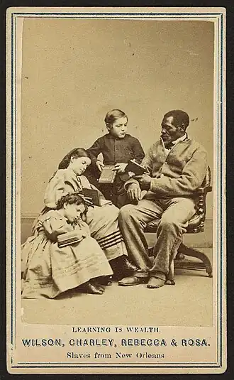 By 1863 in Louisiana, ninety-five schools for freedmen, serving 9,500 students, were active in areas controlled by the Union Army. Funding was needed to continue to run the schools. The National Freedman's Association, the American Missionary Association, and Union officers launched a publicity campaign to raise money by selling carte de visite (CDV) photographs of eight former slaves, five children and three adults. The former slaves were accompanied on a tour of Philadelphia and New York by Colonel George H. Hanks. A woodcut, based on a photograph of the former slaves, appeared in Harper's Weekly in January 1864 with the caption "EMANCIPATED SLAVES, WHITE AND COLORED."[20][10] Four of the children were predominantly white in appearance, although born into slavery.