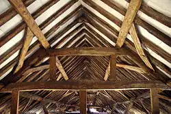 The timber roof of the building is thought not to be the original. It is 16th century and locally made.[19] It is likely that it was taken from another, similar building also bought by John Hales after the Dissolution of the Monasteries.[20]