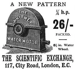 One product that was to have a particularly long run was the Whitney Water Motor, a small (8.5 inch) enclosed Pelton water wheel. Connected to a water supply this could be used to drive light loads via a pulley and belt. Water motors had uses such as laboratory stirrers, charging batteries, and driving sewing machines. It was reported[2] in 1905 that the Whitney Water Motor was rated at 1/4h.p. with 60psi water pressure, which they felt was conservative. It was still advertised in 1931, available as a complete unit, or as a set of castings.