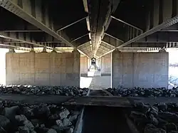 The Whitney Young Memorial Bridge is a bridge that carries East Capitol Street across the Anacostia River and Kingman Lake in Washington, D.C. in the United States. Finished in 1955, it was originally called the East Capitol Street Bridge. It was renamed for civil rights activist Whitney Young in early 1974.[3][4] The bridge is 1,800 feet (550 m) long, its six lanes are 82 feet (25 m) wide, and it has 15 spans resting on 14 piers.[5][6] It passes over the southern end of Kingman Island and is near the site of the former Robert F. Kennedy Memorial Stadium and future New Commanders Stadium.