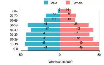 According to the 2002 Poland census, there were 599 people residing in Wiśniowa village, of whom 48.6% were male and 51.4% were female. In the village, the population was spread out, with 27.5% under the age of 18, 37.4% from 18 to 44, 20.9% from 45 to 64, and 14.2% who were 65 years of age or older.[1]