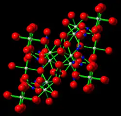 Widgiemoolthalite is a nickel(II) carbonate that has undergone mineral hydration. Tests by Nickel, Robinson, and Mumme yielded the chemical formula (Ni,Mg)5.00(CO3)4.15-(OH)1.70·5.12H2O. The researchers observed that widgiemoolthalite is the nickel structural analog to the hydrated magnesium carbonate hydromagnesite and considering this relationship, determined that widgiemoolthalite's ideal makeup is Ni5(CO3)4(OH)2·4-5H2O though because it may contain either nickel or magnesium, widgiemoolthalite's makeup may also be written (Ni,Mg)5(CO3)4(OH)2·5H2O.[2][12] By weight, the mineral is 49.58% oxygen, 34.41% nickel, 8.05% carbon, 6.11% magnesium, and 1.86% hydrogen.[13] As of 2016, the exact crystal structure of widgiemoolthalite was not known though based on the patterns produced when the mineral was analyzed with X-ray crystallography, a high degree of structural disorder was suspected.[14][15] Under an optical microscope, Nickel, Robinson, and Mumme reported difficulty discerning individual crystals as their lateral dimensions were too small.[2]