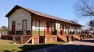 The Wiggins Depot was constructed in Wiggins, Mississippi in 1910 by the Gulf and Ship Island Railroad (G&SIRR) to serve as a replacement for the company's original depot that was destroyed by fire in January of the same year.[4] In the later half of the 20th century, the depot was being used only for storage and had fallen into disrepair. In 1999, the depot was acquired by the City of Wiggins and was designated a Mississippi Landmark. During the first decade of the 21st century, the depot was relocated within the city and was renovated for use as office space.