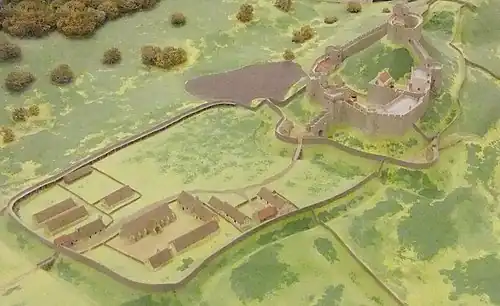 The castle was the subject of extensive works in the late 13th or early 14th century, when it was held by Roger Mortimer (1231-1282),[1] Edmund Mortimer (1282-1304) and Roger Mortimer, 1st Earl of March (lived 1287–1330).[2] The walls were raised, the gatehouse remodelled and other buildings were constructed on the site, including a substantial block, possibly a lodgings range, within the inner bailey.