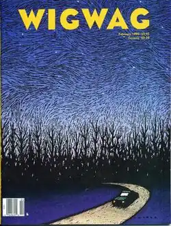 Founded by Alexander "Lex" Kaplen, who worked at The New Yorker, Wigwag eschewed celebrity coverage in favor of personal and literary writing. A test issue was put on newsstands in the summer of 1988, and the magazine formally debuted in October 1989. The magazine attracted writers such as Peter Matthiessen, Terry McMillan, Garry Wills, Alex Heard, Sousa Jamba and Nancy Franklin, but despite a circulation of 120,000, and despite being financially successful, ceased publication when the Gulf War broke out in 1991 and the economy entered a recession. It published its last issue in February 1991. In its brief lifetime it reached a circulation of close to 200,000[1] and became a brand name signifying family-feeling and an appreciation of the qualities of non-metropolitan America.