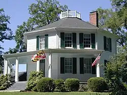 Two stories high, the octagonal house has an 8-sided roof topped by an octagonal "widows walk" flanked by two brick chimneys which serviced 4 fireplaces in the primary living areas and a hearth in the basement. The house faces southeast, with one or two openings in each wall. A modern one-story wing (constructed 2011, replaced ca.1900 structure) runs northwest. There is a three-sided porch facing east, southeast, and south.