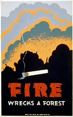 Since the turn of the 20th century, various federal and state agencies have been involved in wildland fire management in one form or another. In the early 20th century, for example, the federal government, through the U.S. Army and the U.S. Forest Service, solicited fire suppression as a primary goal of managing the nation's forests. At this time in history fire was viewed as a threat to timber, an economically important natural resource. As such, the decision was made to devote public funds to fire suppression and fire prevention efforts. For example, the Forest Fire Emergency Fund Act of 1908 permitted deficit spending in the case of emergency fire situations.[3] As a result, the U.S. Forest Service was able to acquire a deficit of over $1 million in 1910 due to emergency fire suppression efforts.[3] Following the same tone of timber resource protection, the U.S. Forest Service adopted the "10 AM Policy" in 1935.[3] Through this policy, the agency advocated the control of all fires by 10 o'clock of the morning following the discovery of a wildfire. Fire prevention was also heavily advocated through public education campaigns such as Smokey Bear. Through these and similar public education campaigns the general public was, in a sense, trained to perceive all wildfire as a threat to civilized society and natural resources. The negative sentiment towards wildland fire prevailed and helped to shape wildland fire management objectives throughout most of the 20th century.