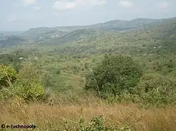 The natural vegetation varies, with tropical savannah occurring in the centre and north of the country, moist semi-evergreen forests in the mountainous areas, and mangrove forests near the coast. As the country is densely populated, only remnants of the forests survive outside of national parks and reserves. The Oti Plateau and some mountainous areas retain more of their natural vegetation than elsewhere.[2] The forest belt found in some neighbouring countries has largely been destroyed,[8] and the Guinean forest–savanna mosaic ecoregion, consisting largely of grassland, interspersed with woodland on steep slopes and besides watercourses, stretches all the way to the coast. This results in the Dahomey Gap between the Upper Guinean forests to the west and the Lower Guinean forests to the east.[9] The coastal zone consists of lagoons, creeks and ponds and the forest here is dominated by red and black mangroves. This area has been designated as a Ramsar site of international importance to wetland birds.[10]
