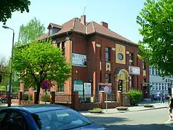 - Former presbytery at 7 Wileńska Street – built between 1909 and 1911, designed by Jürgen Kröger in a semi-modernist style.[8] It is a freestanding,[17] two-story building on a rectangular plan,[8][17] made of red brick with plastered decorative elements.[8] The front façade features a decorative portal, semicircularly closed, flanked by Ionic columns with capitals. Above the portal is an oculus. In front of the building stands Racibórz's only remaining old gas lantern (now converted to electric).[8][17] The side façade features an avant-corps,[8] and the building is topped with a mansard roof.[8][17]