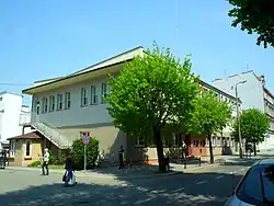 The school building at 6 Wileńska Street, initiated by Adolf Kaschny, was completed in stages, first in 1932 and fully by 1 April 1934. Initially, it housed three vocational schools: the Crafts Vocational School (Gewerbliche Berufsschule), the Merchant School (Kaufmännische Berufschule), the School for Pharmacists (Drogistenfachschule), as well as the Higher Commercial School (Höhere Handelsschule) and the Municipal Commercial School (Städtische Handelsschule).[2][15][16] The building was equipped with an air-raid shelter, and in 1944, a lazaretto was established there.[2] Toward the end of World War II, one corner of the building was destroyed by a bomb. On 24 June 1945, the Polish authorities took over the building, and classes resumed as early as 15 October that year. On 1 September 1946, a carpentry class and two additional vocational training classes were launched. Over the years, many types of schools operated in the building.[31] Currently, it houses Technical School No. 2, Supplementary Technical School No. 2 for Adults, Vocational School No. 2, and Post-Secondary School No. 2.[32] The school also includes a gymnasium built in 1894, which originally served as the town's sports hall before the school's establishment.[10][15][16]