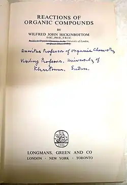 Hickinbottom wrote a textbook, Reactions of Organic Compounds. it was first published in 1936,[4] with a second edition in 1945 and a third in 1957.