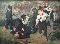 Trübner was born in Heidelberg. He was the third son of a silver- and goldsmith, Johann Georg Trübner, and his wife Anna Maria.[2] In 1867 he began training as a goldsmith in Hanau, and met classicist painter Anselm Feuerbach who encouraged him to study painting.[2] In that year he began studies at the Kunstschule in Karlsruhe under Karl Friedrich Schick.[2] He was influenced by artists he met in Karlsruhe, such as Hans Canon and Feodor Dietz.[3][2] In 1869 he began studying at the Kunstacademie in Munich, where he was greatly impressed by an international exhibition of paintings by Leibl and Gustave Courbet. Courbet visited Munich in 1869, not only exhibiting his work but demonstrating his alla prima method of working quickly from nature in public performances.[4] This had an immediate impact on many of the city's young artists, who found Courbet's approach an invigorating alternative to the shopworn academic tradition.
