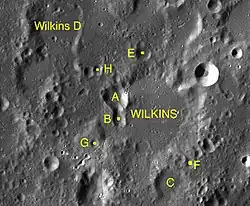 By convention these features are identified on lunar maps by placing the letter on the side of the crater midpoint that is closest to Wilkins.[4]