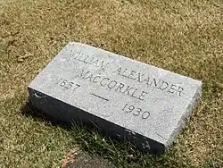 William Alexander MacCorkle (May 7, 1857 – September 24, 1930), was an American teacher, lawyer, prosecutor, the ninth governor of West Virginia and state legislator of West Virginia, and financier. His residence in Charleston, known as Sunrise, is listed on the National Register of Historic Places.