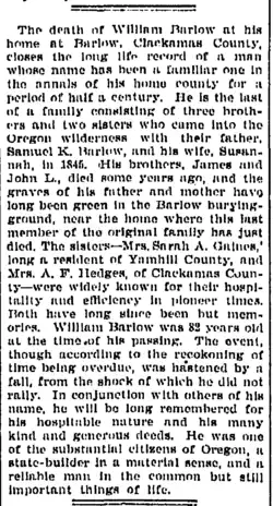 Barlow arrived in Oregon as a young man in 1845. He purchased land and founded the town of Canemah,[2] now part of Oregon City, Oregon.[3] When William and his brother James were tending the toll gate on the Barlow Road in 1847, they met their brides-to-be, Rachel and Rebecca Larkins, the young daughters of William E. Larkins and his wife, Rachel Reed. On August 20, 1848, William married Rachel. She died a month later.