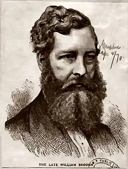 Brough was born in London, the son of Barnabas Brough, a brewer, publican, wine merchant and later dramatist, and his wife Frances Whiteside, a poet and novelist.[1] He was the brother of writer Robert (father of actress Fanny Brough), actor Lionel and science writer John Cargill Brough. His father was briefly kidnapped by the Chartists in 1839 and was a prosecution witness at the trial of the Chartist leader John Frost, which resulted in Frost's deportation to Australia. The family was ostracised and ruined financially as a result, and they moved to Manchester in 1843.[2] Brough was educated at Newport, Monmouthshire, and apprenticed to a printer at Brecon.[3]