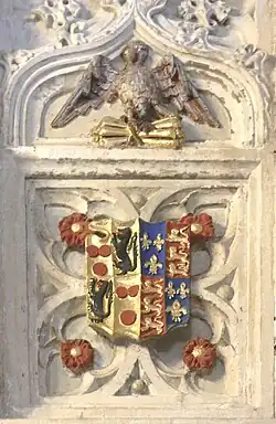 - ^ No marital relationship seems to have existed between the Courtenay and Speke families but the Courtenay arms may have been displayed simply in deference to the Earl as the most powerful man in Devon. Arms: Baron: quarterly 1st & 4th Courtenay, 2nd & 3rd de Redvers (lion should be azure not sable, possible restoration error) impaling femme: royal arms of King Edward IV (1461–1483), father of his wife Catherine of York (the sixth daughter of King Edward IV by Elizabeth Woodville). The Roses surrounding the escutcheon should be the White Rose of York not the Red Rose of Lancaster as shown here possibly due to erroneous restoration. The heraldic badge above (not the Courtenay crest of a plume of ostrich feathers) seems to have been adopted during the Wars of the Roses and depicts Jupiter, king of the gods, in guise of an eagle, holding in his claws a thunderbolt, the emblem of that deity. This is a well-known image often displayed on classical Greek and Roman coins. Mediaeval nobles frequently kept classical cameos and other valuables in their cabinets as curiosities, and thus the imagery would have been familiar.