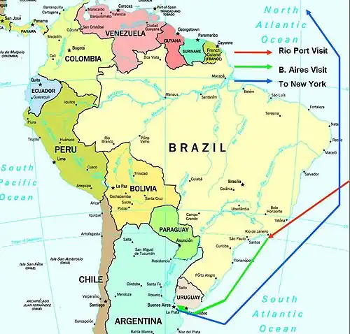 Columbus arrived at Rio de Janeiro on July 29, 1843, and spent two months in port before proceeding to Buenos Aires. It was in Buenos Aires that Parker personally met Juan Manuel de Rosas and quickly recognized him as a "cruel ruthless dictator".