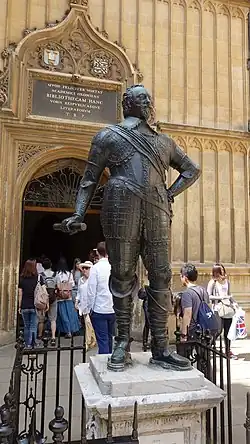 A life-size bronze standing statue of William Herbert, 3rd Earl of Pembroke, was sculpted by Hubert Le Sueur (c. 1580-1658) and stood at the family seat of Wilton House, Wiltshire. In 1723 Thomas Herbert, 8th Earl of Pembroke (1656–1733) donated the statue to the Bodleian Library at Oxford University in recognition of his office as Chancellor of the University of Oxford from 1617 until his death, for having promoted the founding of Pembroke College, Oxford and for having donated many manuscripts to the Bodleian Library in 1629. The statue was first housed in the Bodleian Picture Gallery on the third floor, but in 1950 it was moved outdoors to its present location in front of the main entrance to the Old Bodleian Library, looking east across the Schools Quadrangle. The statue is Grade II listed.[11] The square stone plinth is inscribed on two sides in Latin: