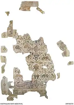 As an enthusiastic amateur archaeologist, Woods also wrote to Garland about objects which he and the men found – coins, relics, and most significantly, the Shellal Mosaic. Discovered by troops on 17 April 1917 during the Second Battle of Gaza, this mosaic was eventually shipped to Australia bound for the Australian War Memorial, and Woods was responsible for overseeing its excavation and transportation. In one letter, dated 27 June 1917, he described the "fearful heat" of the excavation, and the "trials and difficulties of getting it so far from Palestine" including negotiation with the Cairo Museum authorities. In other letters he commented on the various ruins and archaeological sites he saw in his travels. In keeping with his religious and historical interests, he often gave informal lectures to the troops about different aspects of the Holy Land, and reported the success of these small ventures to Garland. Because censorship often prevented Woods from revealing his precise location in his letters, he sometimes alluded to his whereabouts by drawing on his knowledge of antiquity, or using biblical references.[2]