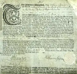 William Spencer, son of Anthony Spencer, was born in around 1751 in England.[1][2] On 4 November 1766, at the approximate age of fifteen, William Spencer signed a seven-year contract of indenture (pictured) to Richard Rust, "Citizen and Grocer" of London, England. The contract indicated that his father Anthony Spencer was a shoemaker of the parish of Church Minshull in the County Palatine of Chester, now simply known as Cheshire. In consideration of the sum of ten pounds paid by William's father, Richard Rust agreed to instruct his apprentice, as well as provide him with the necessities of life, including food, drink, clothing, and lodging.[1]